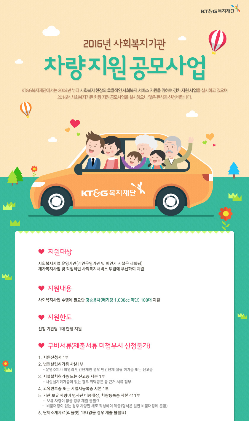 KT&G복지재단에서는 2004부터 사회복지 현장의 효율적인 사회복지 서비스 지원을 위하여 경차 지원 사업을 실시하고 있으며 2016년 사회복지기관 차량 지원 공모사업을 실시하오니 많은 관심과 신청 바랍니다.